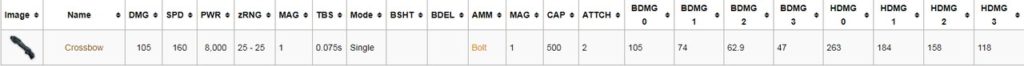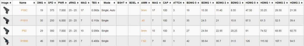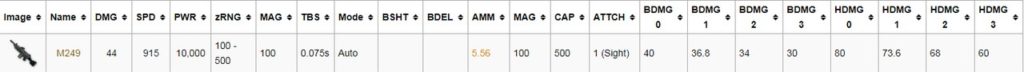 | Название | Урон | Дальность (м) | Модули | Скорость пули | Размер магазина | Режим стрельбы | Боеприпасы |