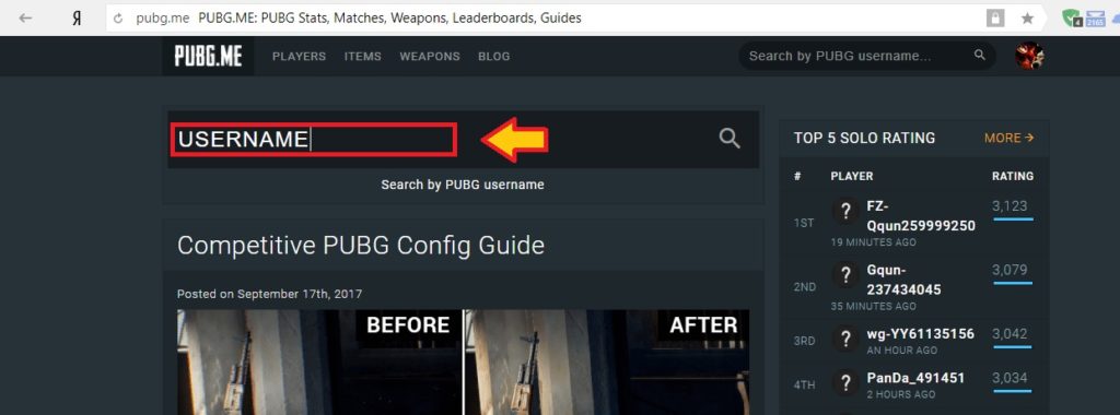 - Заходим на PUBG.ME и в верхней части вводим ник сопартийца. (Важно! Ник должен полностью совпадать, иначе ничего не получится)