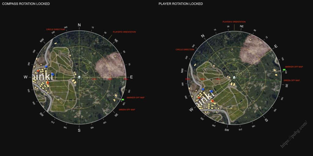 Так, миникарта по версии упомянутого пользователя reddit может либо вращаться в зависимости от направления движения персонажа, либо оставаться статичной (опция включается/открлючается в настройках). Нарисованная миникарта отображает: компас, маркеры (даже те, что расположены далеко), направления к союзникам (при этом цвета союзников соответствуют цветам их маркеров) и к центру круга, а также индикаторы для быстрого определения дистанции (100, 200 и 300 метров).
